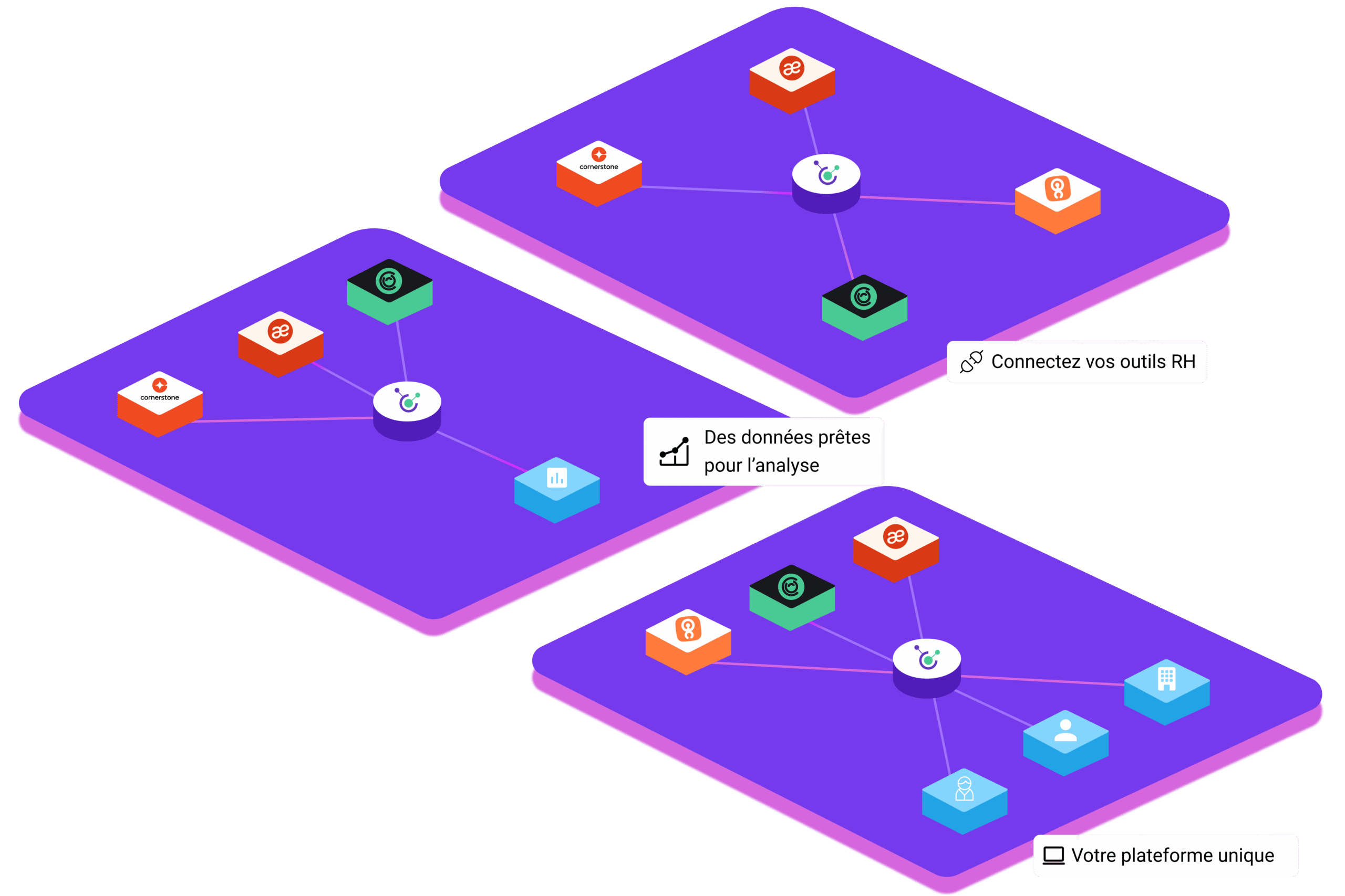 Vous obtenez une interopérabilité sans faille. Gérez vos collaborateurs de façon unifiée et faites collaborer vos outils – sans effort. Ce n’est pas juste une question de connecter des outils, c’est créer une source unique de vérité pour vos opérations RH. Une plateforme. Un seul endroit. Une expérience collaborateur unifiée.