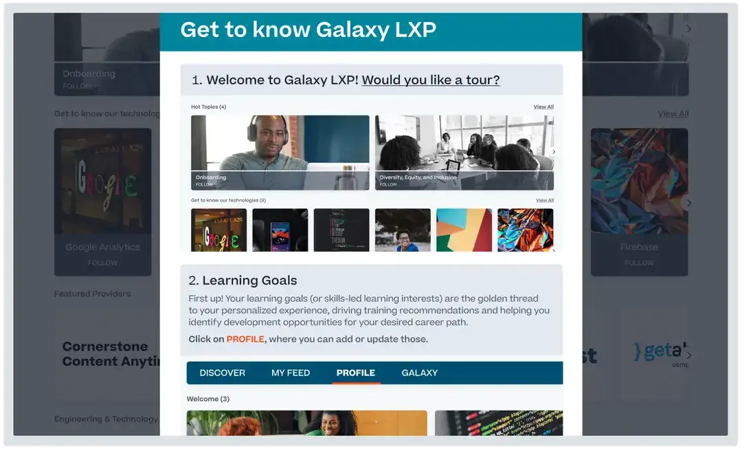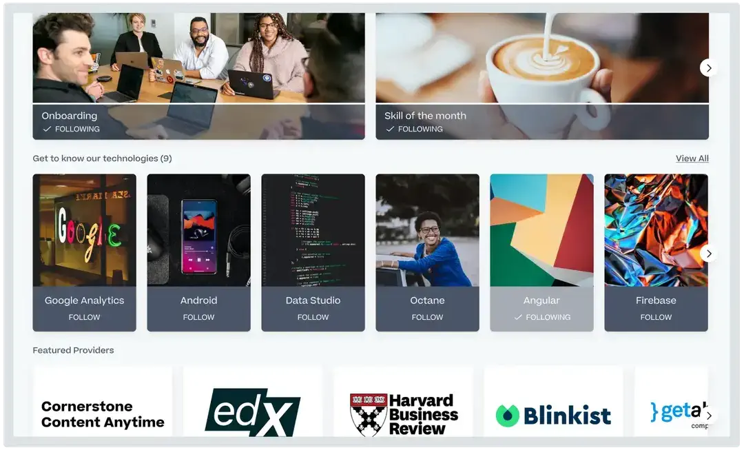 The Cornerstone Learning Experience Platform (LXP) delivers an employee-centered learning experience. Powered by artificial intelligence, it creates skills-based personalized learning journeys while centralizing content (videos, courses, documents) for easier access. Through the Skills Graph, it identifies skill needs and fosters professional growth. The LXP also encourages knowledge sharing and peer collaboration, creating true communities of practice.