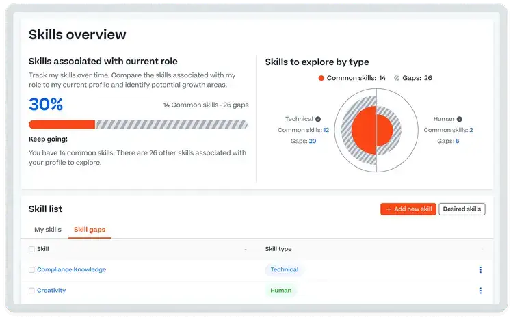 - Skills Transformation: Discover the existing skills within your organization, identify those aligned with your strategy, and uncover the gaps to be filled. Plan targeted actions and mobilize your workforce accordingly.